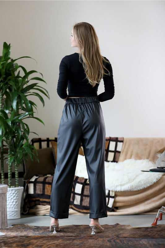 Brown Vegan Leather Pleat Front Pants