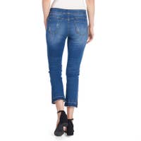 Embellished with sparkles and distressed to perfection, this ultra-flattering pull-on jean blends bling and edginess for the style of the moment.